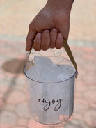 Elevate your party decor with our versatile Acrylic Ice Bucket. Made with transparent acrylic and convenient handles, it easily holds snacks, beverages, and accessories while adding a fun touch with its cute phrase. Plus, its sturdy design ensures stylish and hassle-free serving.