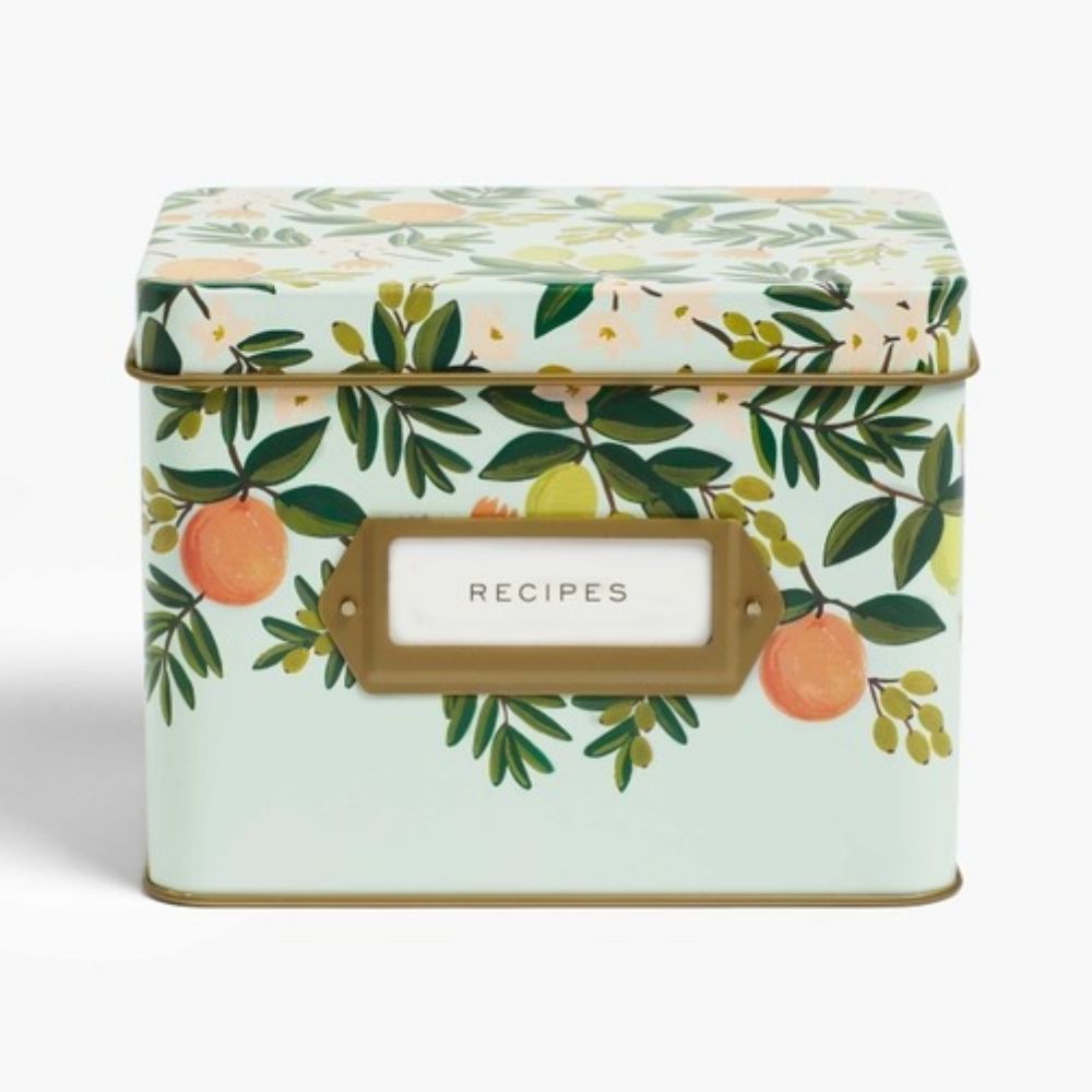 Store your favorite recipes in style with this peach-colored metal recipe tin, featuring charming floral citrus accents. Perfectly designed to hold your treasured recipe cards, it adds a touch of whimsy and sunshine to your kitchen while keeping your culinary inspirations organized and safe.