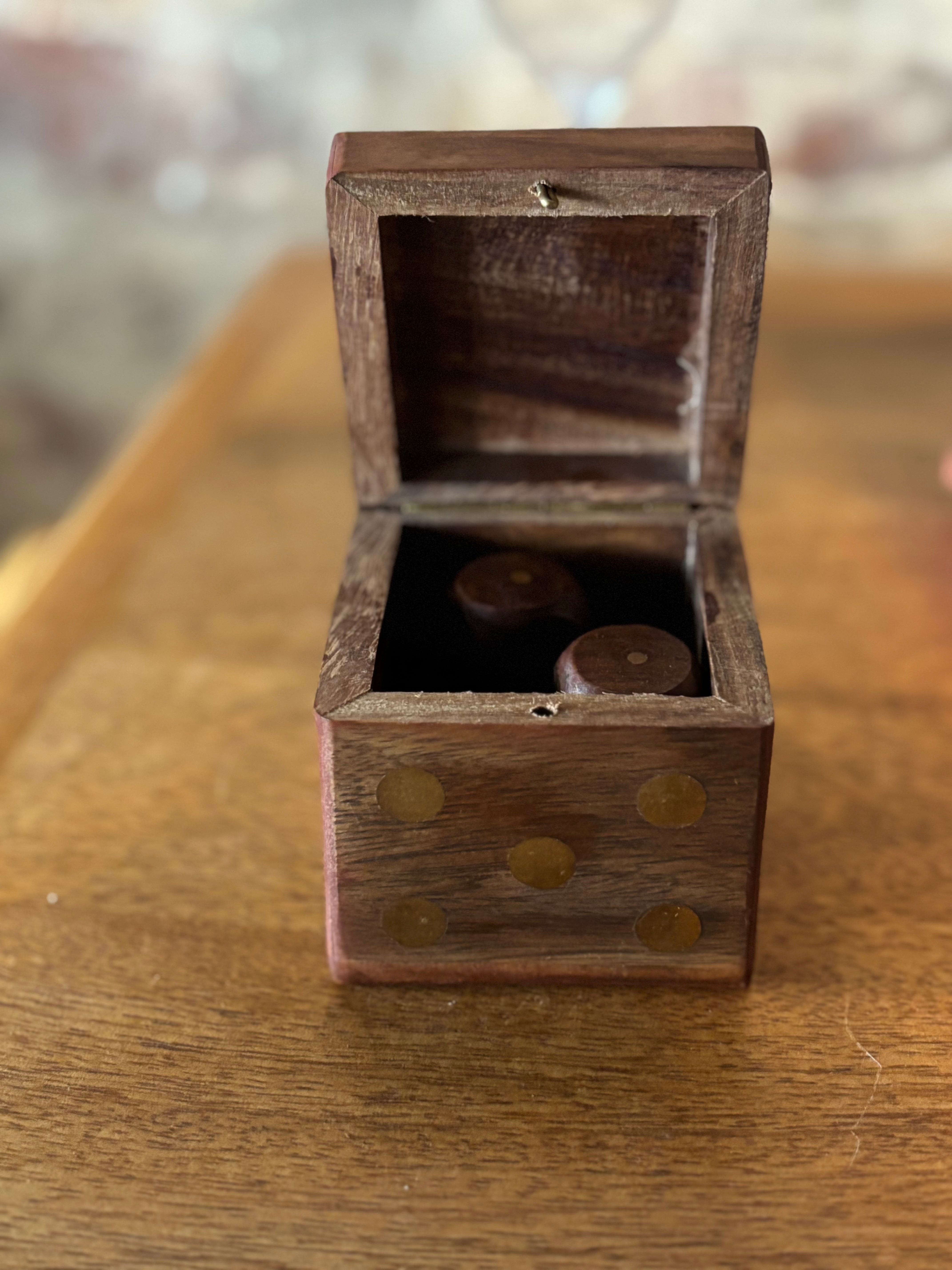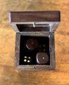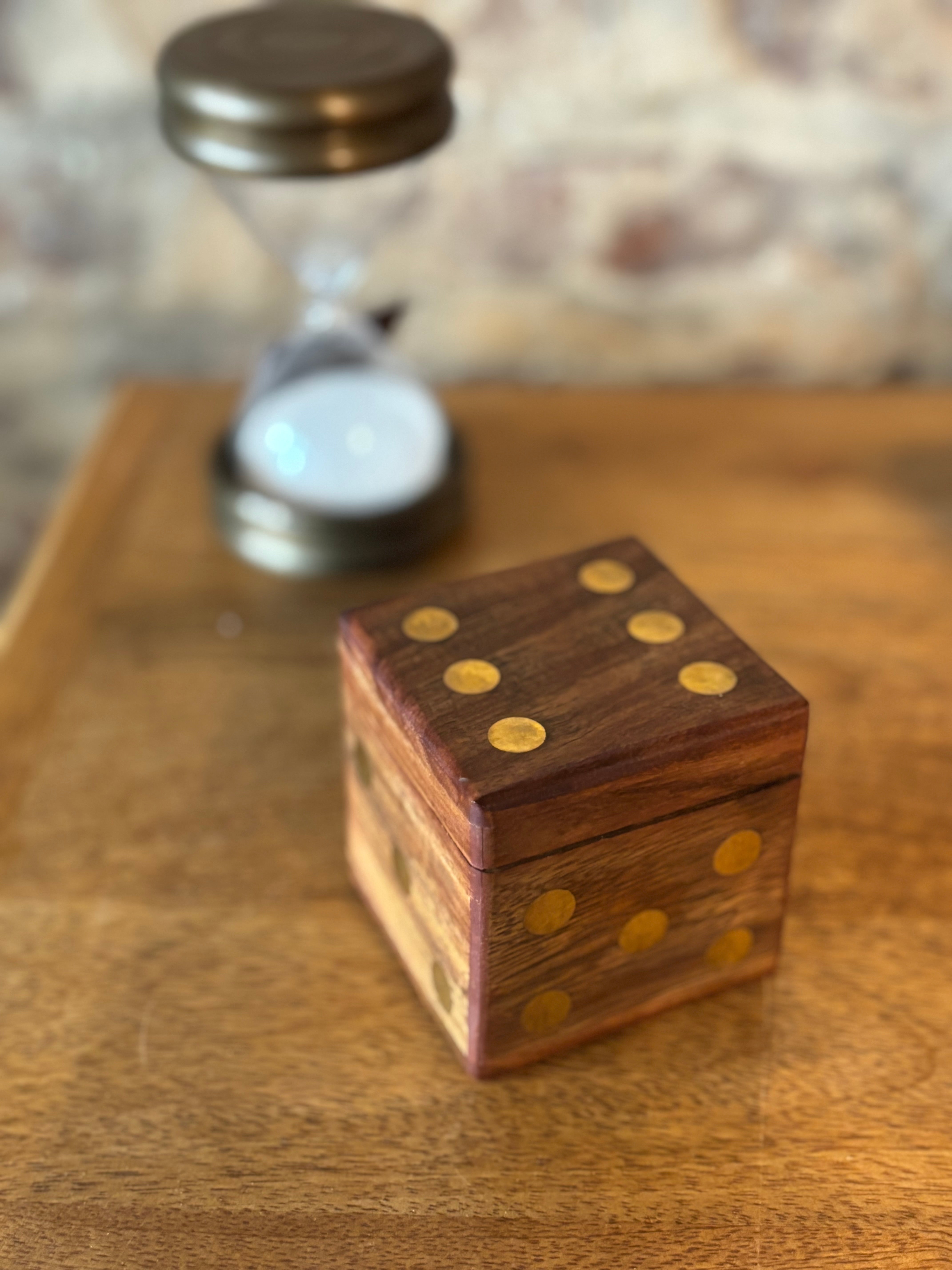 Never lose your game pieces again with the Dice Box! This box comes with six sheesham wood and brass dice and box. Compact at 2.5x2.5 inches, it's the perfect back-up for all your gaming needs.