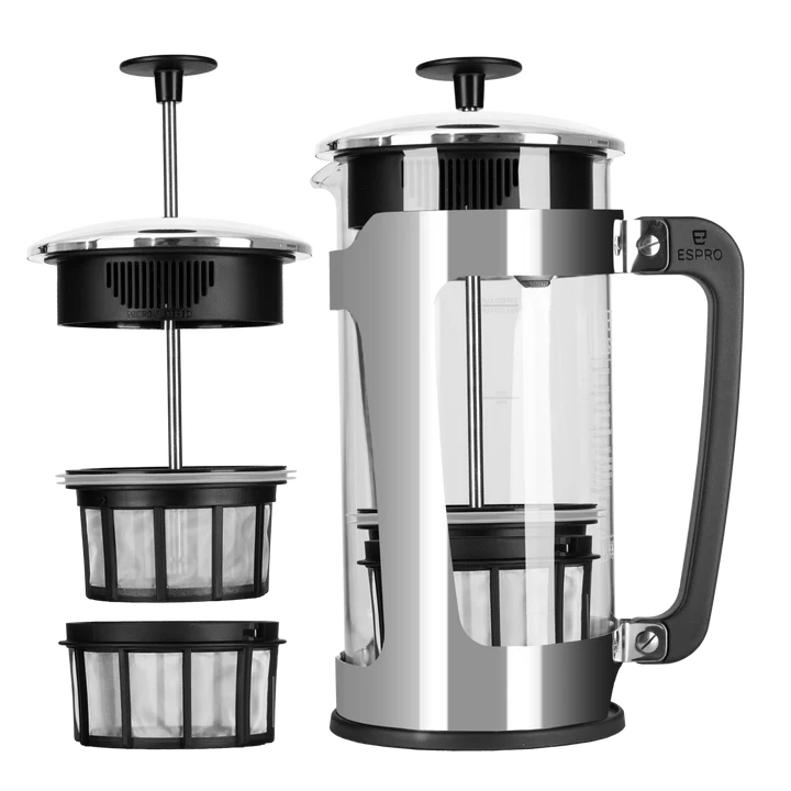 Experience the perfect cup of coffee with our French Press. Espro’s patented Dual Micro-Filter system guarantees a grit-free brew, while the AirLock™ technology maintains consistent taste from first cup to last. Made with premium borosilicate glass and a secure locking mechanism, our press offers safety and peace of mind. Compatible with paper filters for pour-over quality.