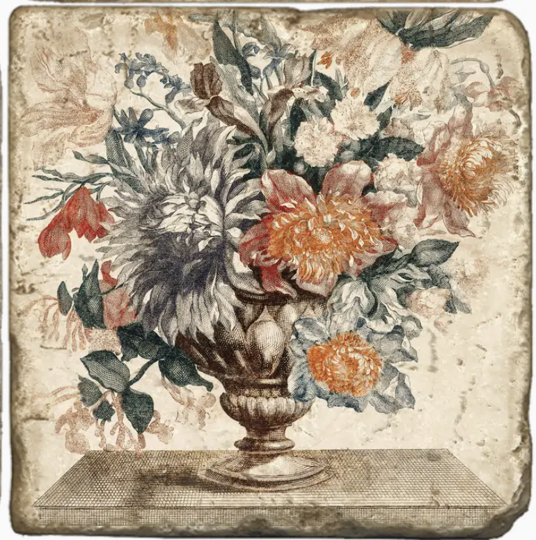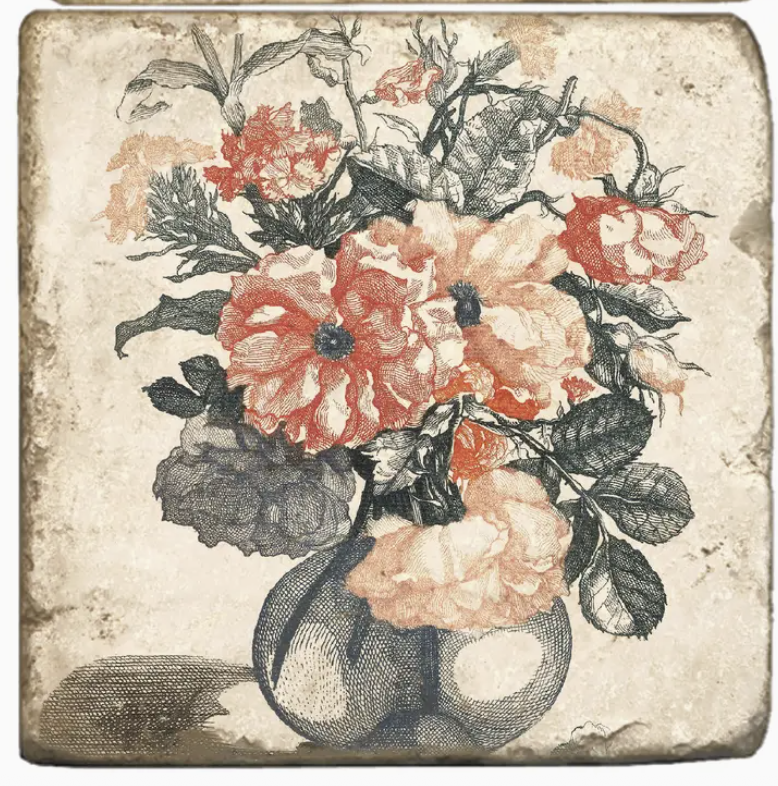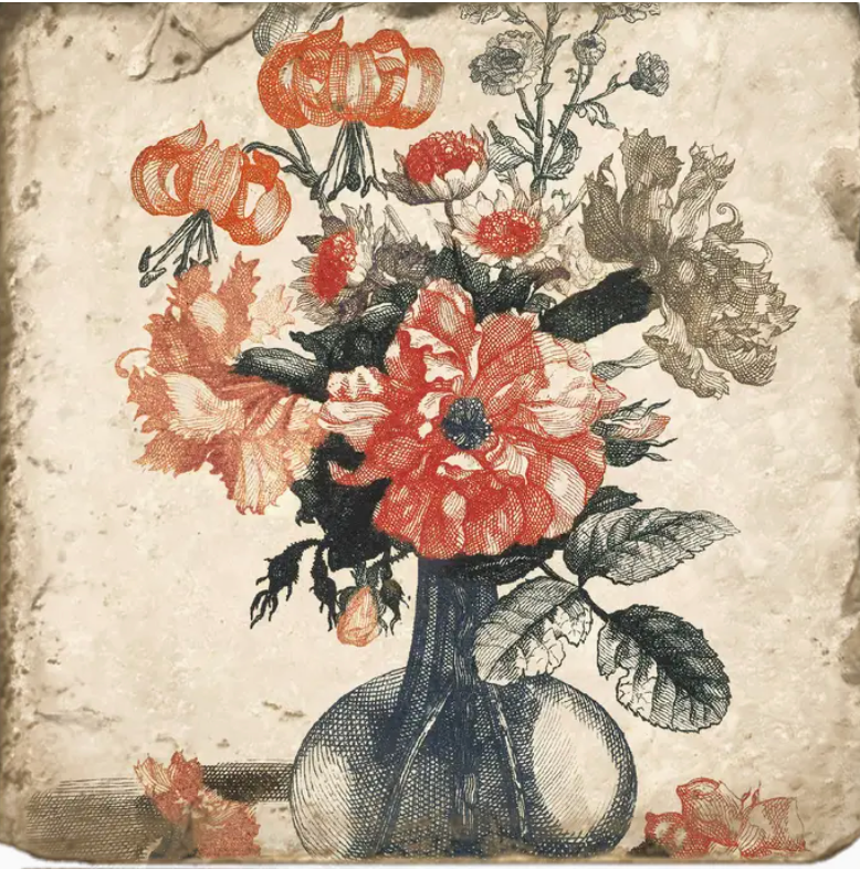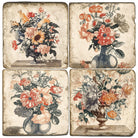 Add a whimsical charm to your table with this set of four handcrafted marble coasters, each adorned with delicate images of Teyler Flowers. Crafted from natural Botticino marble, every coaster showcases unique patterns that highlight its authentic beauty. The soft cork backing protects your surfaces while lending a cozy touch. Easy to clean and full of artistic grace, these coasters blend elegance and function perfectly for your home.