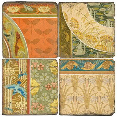 These inspired coasters feature enchanting dragonfly illustrations by Maurice Pillard Verneuil. Made in the USA from tumbled Italian marble and backed with cork, these coasters are a unique and stylish addition to any home. Protect your furniture with a touch of artistry.
