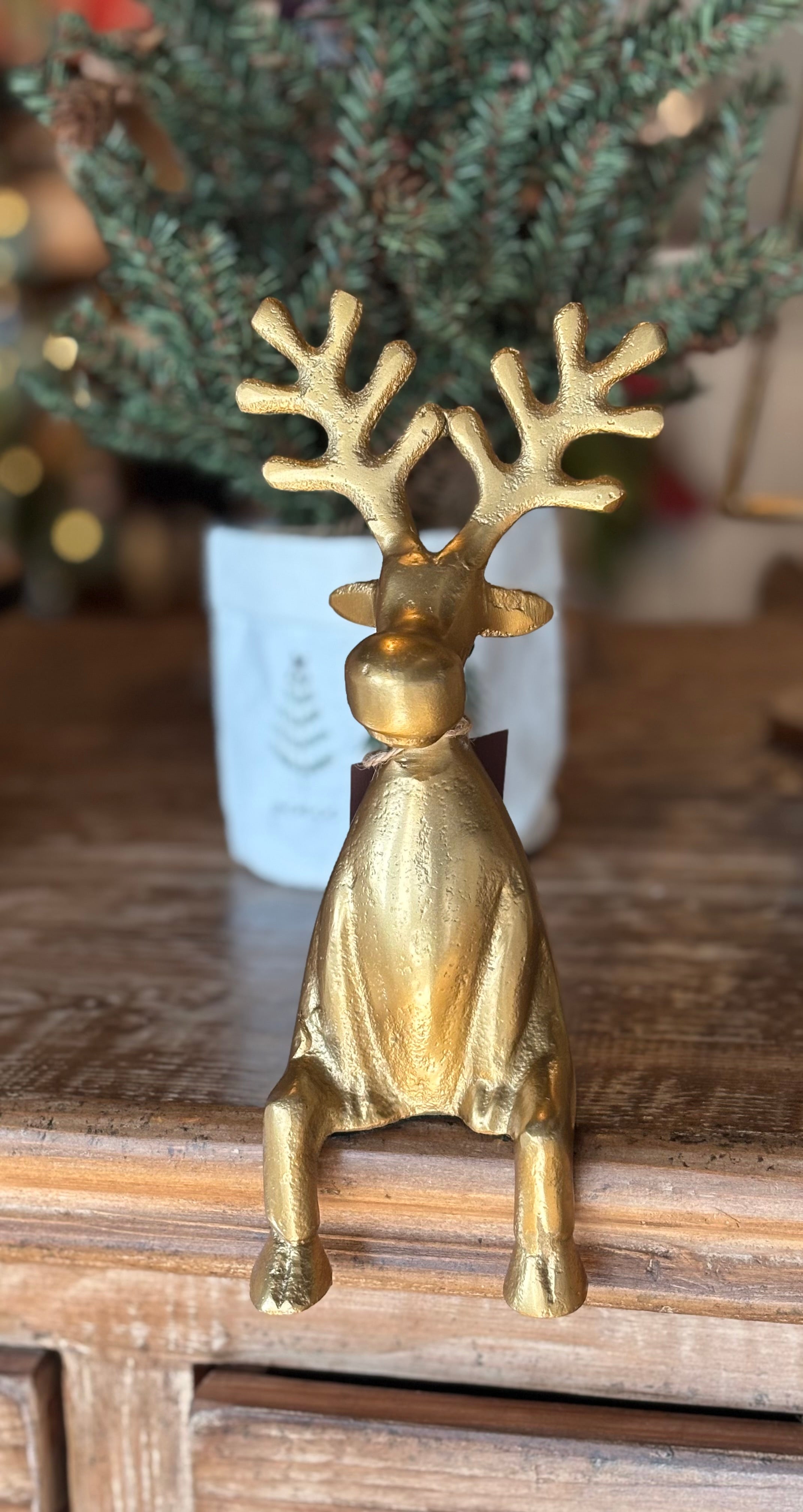 Bring whimsy to your space with the Sitting Reindeer. Gold and made of metal it stands at 7.67 inches, it's perfect for adding a festive yet stylish touch to your holiday decor. Add it to your mantel or bookshelf for a unique and eye-catching accent.