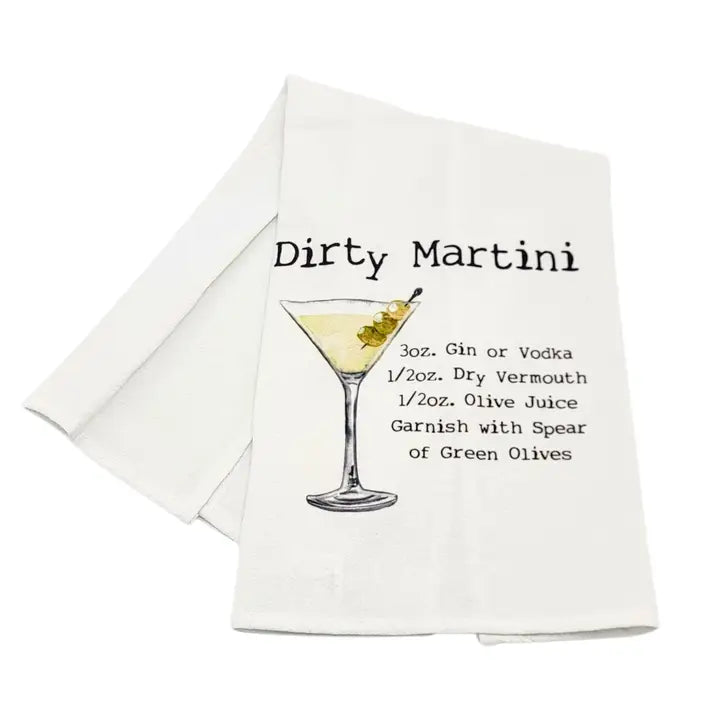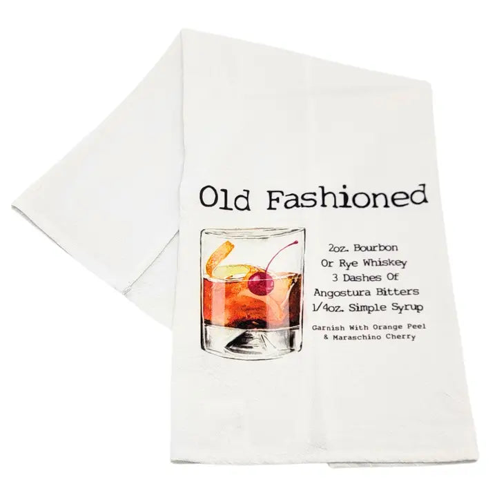 Our 100% crinkled cotton flour sack towels are perfect for adding a touch of charm to your kitchen or bar. Made in the USA, our towels feature unique designs with classic drink recipes. Printed with non-toxic ink that is both durable and machine washable.