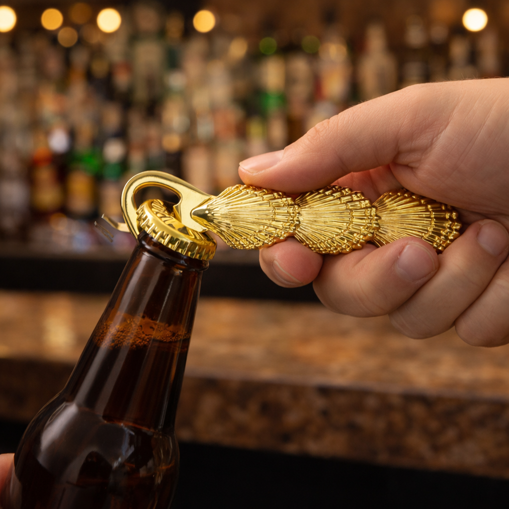 Add a splash of seaside charm to your gatherings with the Theo Shell Bottle Opener. Crafted from gold-plated stainless steel and inspired by the playful spirit of a French Bulldog, this opener blends durability with whimsical elegance. Perfect for beach lovers and cocktail fans, it’s a stylish companion for every bottle you pop.