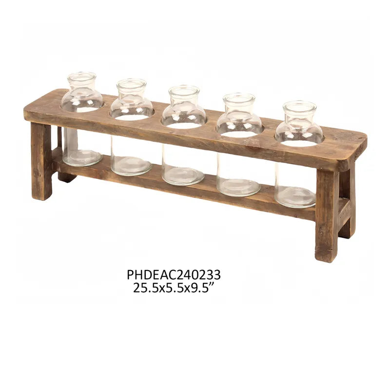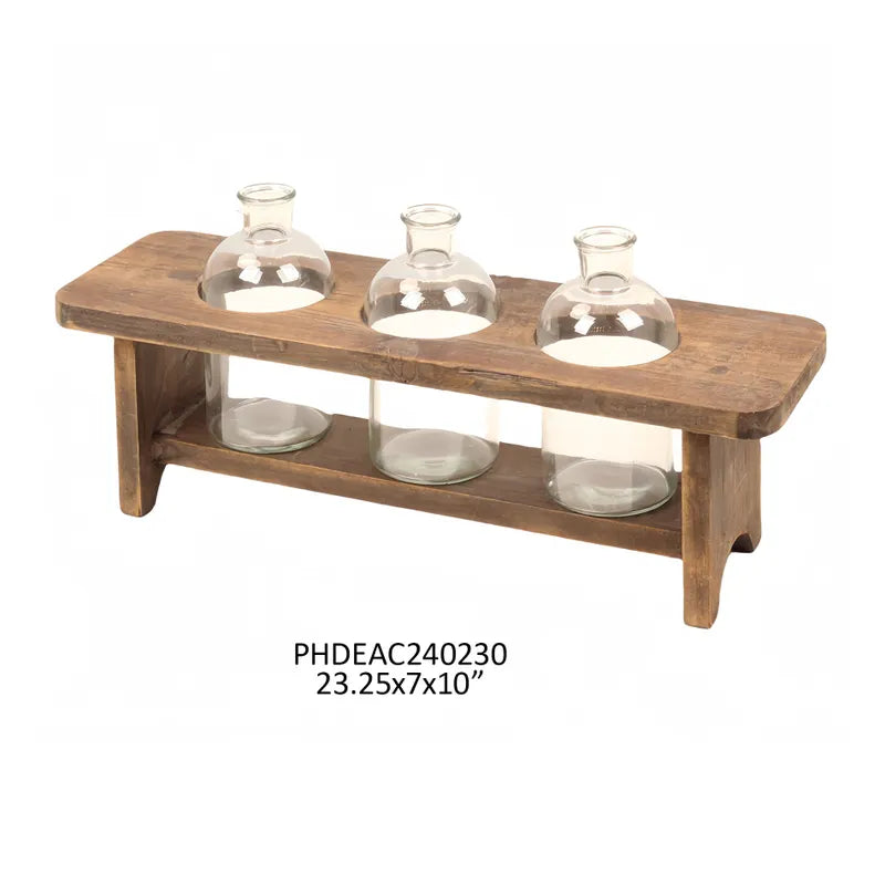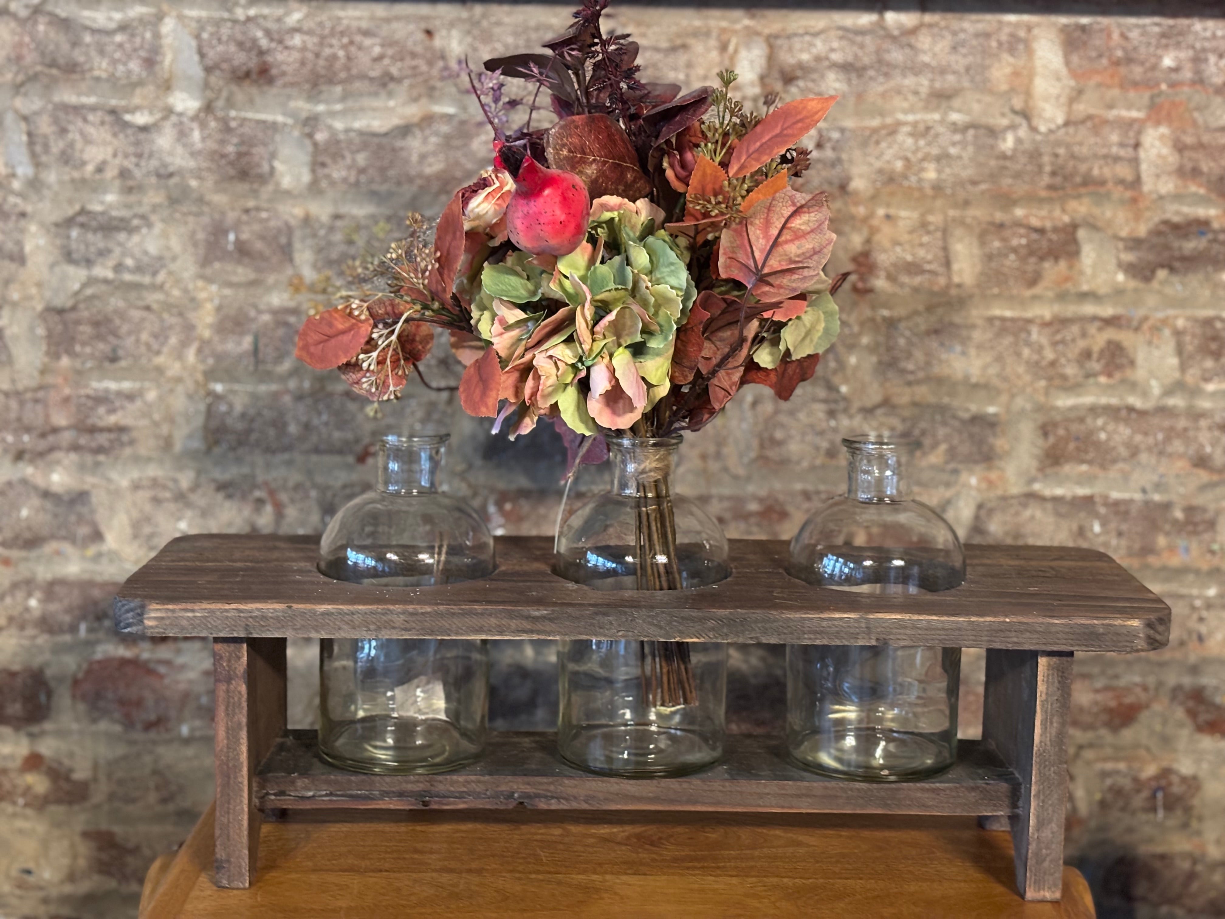 Create a unique and charming display in your home with these Floral Display. Made of a beautiful wood frame and glass bottles, you can choose either the 5 or 3 bottle option. Perfect for adding a touch of style to any room, while showcasing your favorite flowers or greenery.