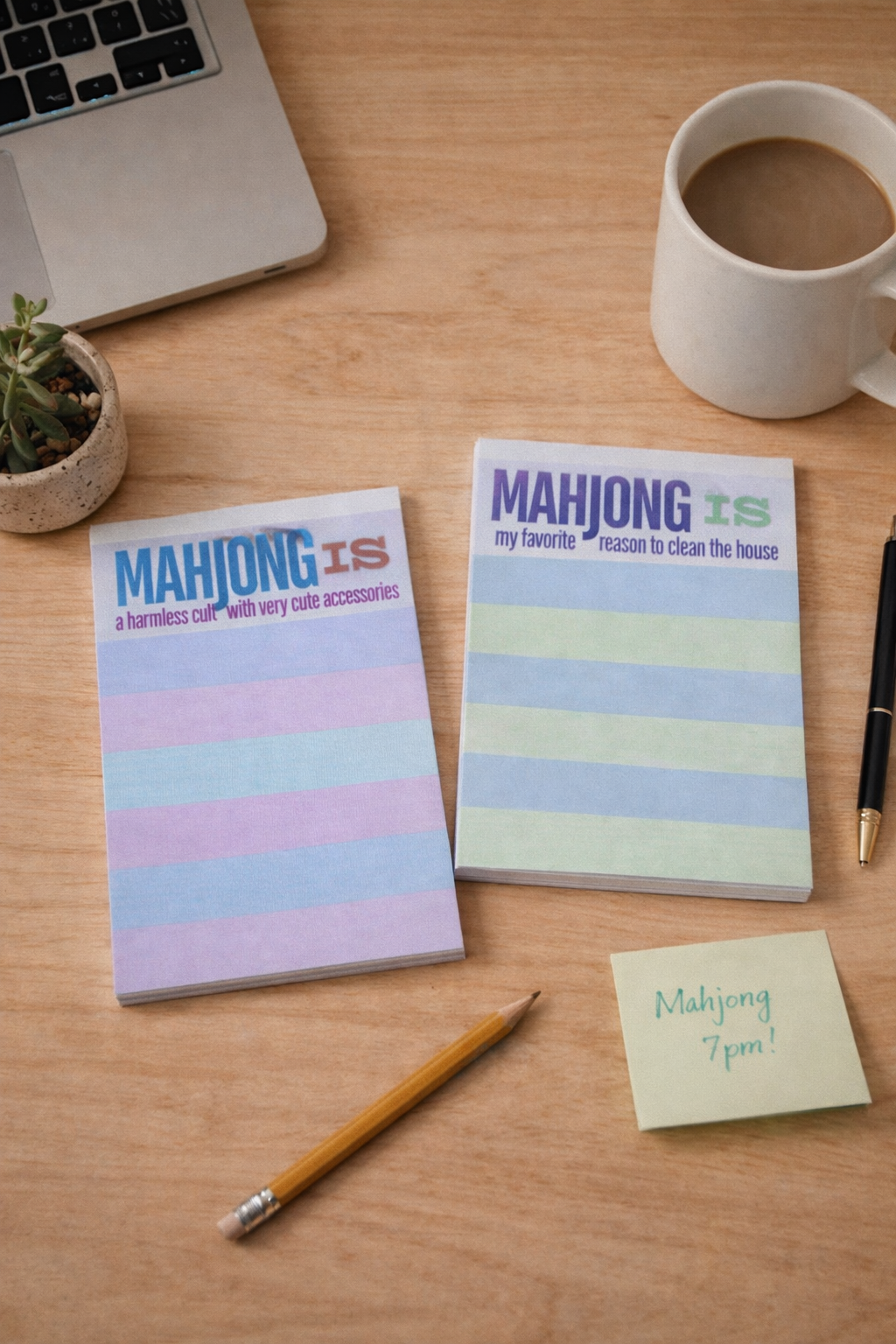 Transform your daily tasks into a game with this delightful 5x7-inch notepad! Featuring 100 vibrant pages adorned with soft pastel stripes, it's the perfect companion for list-makers and mahjong enthusiasts alike. Each pad celebrates the joy of the game with a playful "Mahjong Is" saying that resonates with every player. Whether you're planning your week, jotting down ideas, or simply adding a splash of color to your desk, this notepad brings whimsy and personality to your everyday moments. A charming way to blend your passion for mahjong into your routine.
