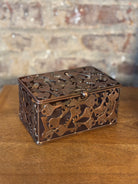 This handcrafted antique copper-colored metal box is made of assorted recycled iron keys, providing a unique and sustainable storage solution. Measuring at 4” x 6” x 3” inches, it's handcrafted in India through fair trade partner Noah's Ark.
