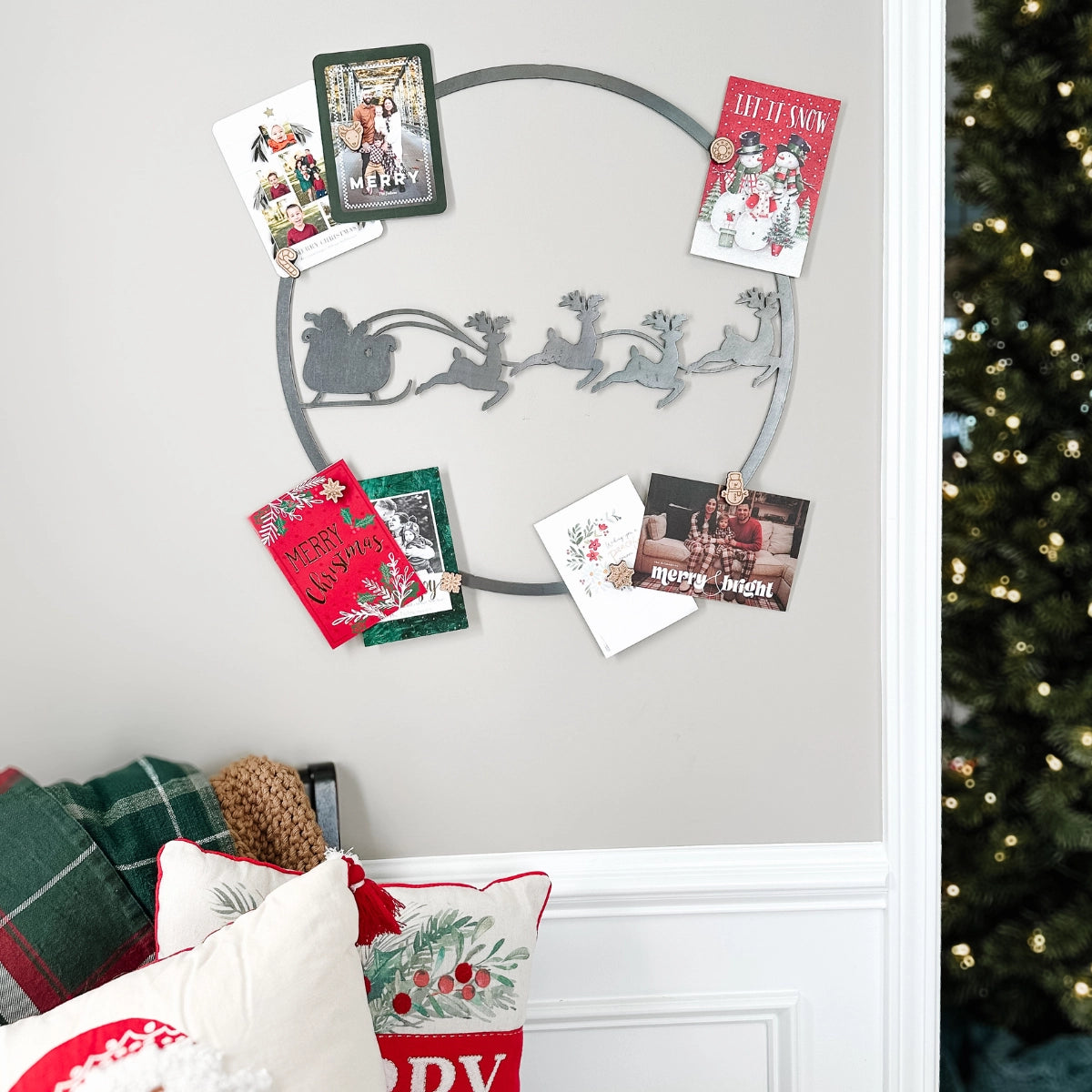 Celebrate the magic of the season with the Santa's Sleigh Card Holder—an enchanting 16-inch magnetic wreath perfect for showcasing your holiday cards and greetings. Featuring Santa and his sleigh, this whimsical display adds festive charm to any room while keeping your favorite holiday wishes front and center. Easy to use and delightfully merry, it’s the perfect way to spread joyful cheer throughout your home.