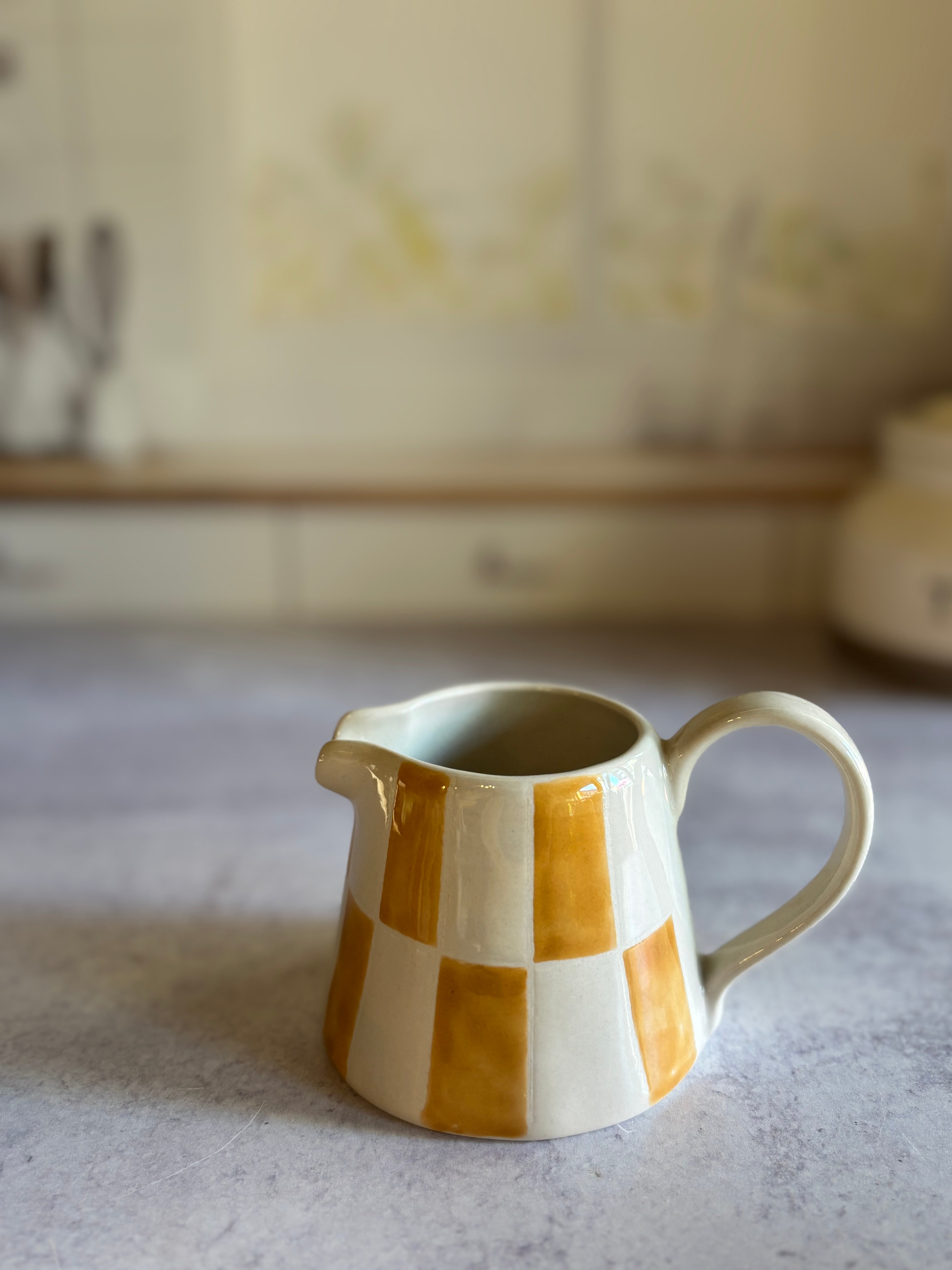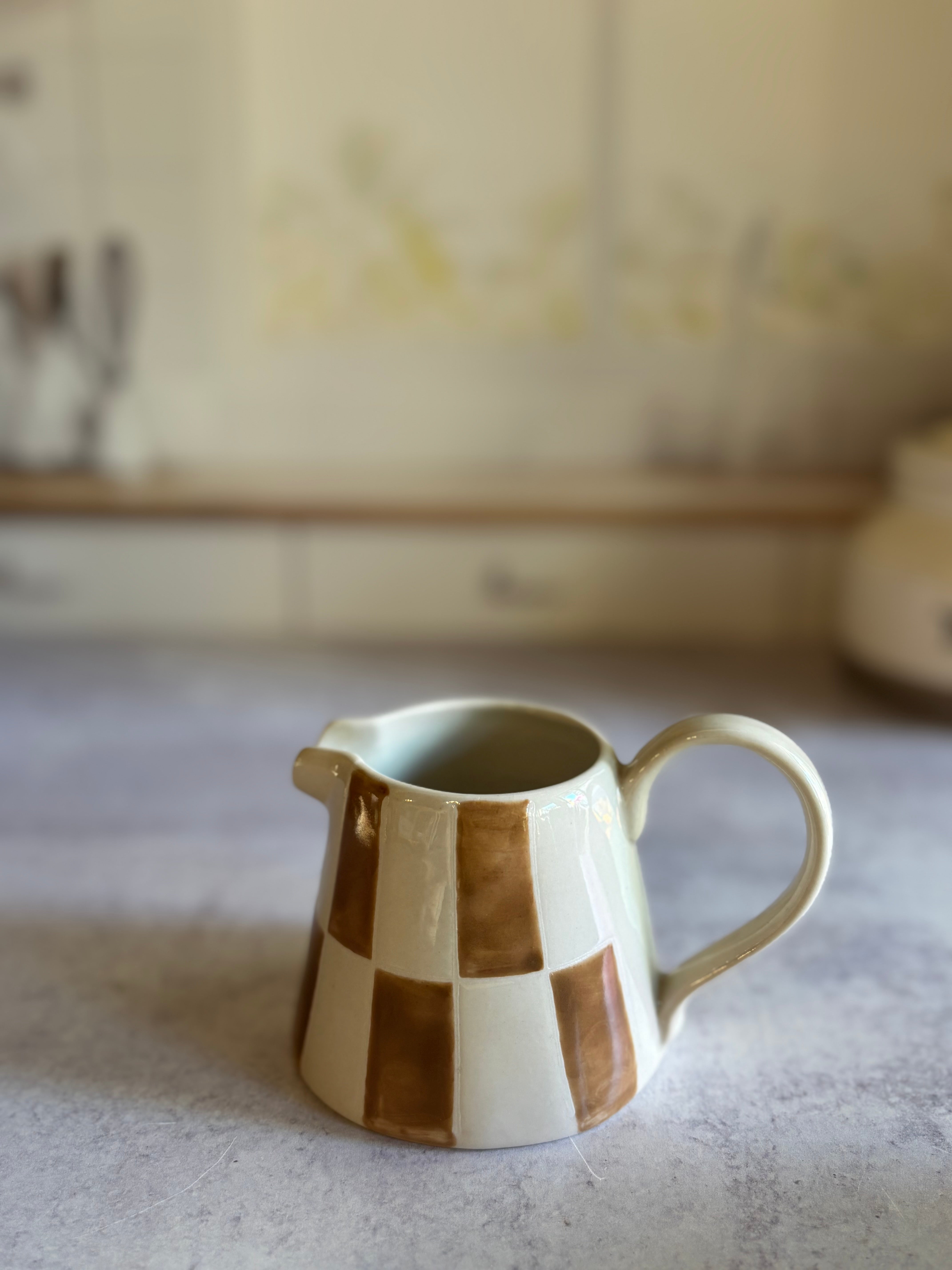 Add a charming touch to your table with this whimsical stoneware creamer, adorned with a classic checked pattern. Sized just right at 4-1/2" x 3-1/4" x 3", it’s perfect for serving cream or milk with your favorite coffee or tea. Available in three delightful colors, this durable creamer brings both style and function to any kitchen or dining room, making every meal feel a little more special.