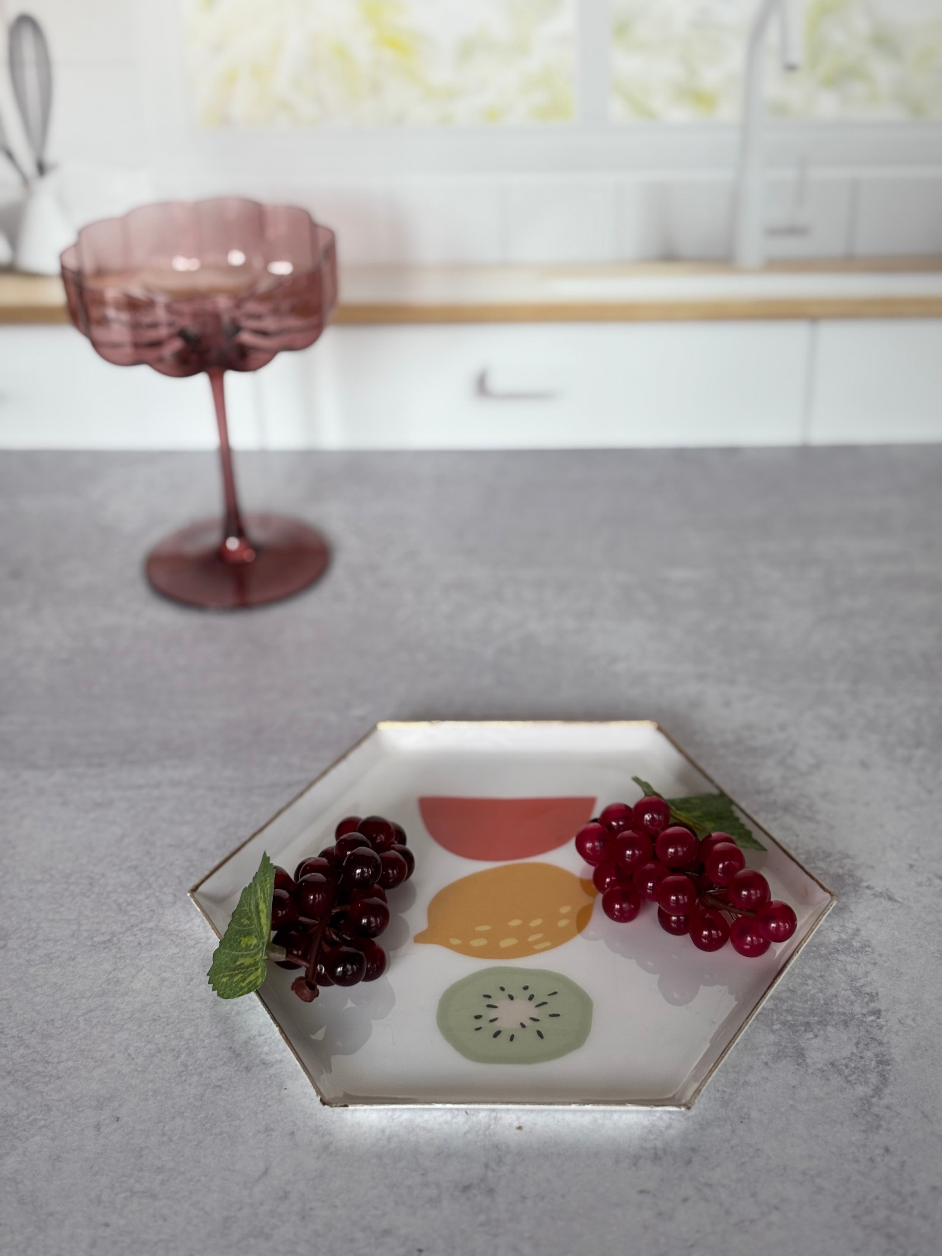 Add a touch of whimsy to your table setting with an enameled tray. The gold rim adds a touch of sophistication to any occasion. Perfect for serving appetizers, desserts, or drinks, its durable metal design and modern shape make it both stylish and functional. Elevate your dining experience with this chic tray.