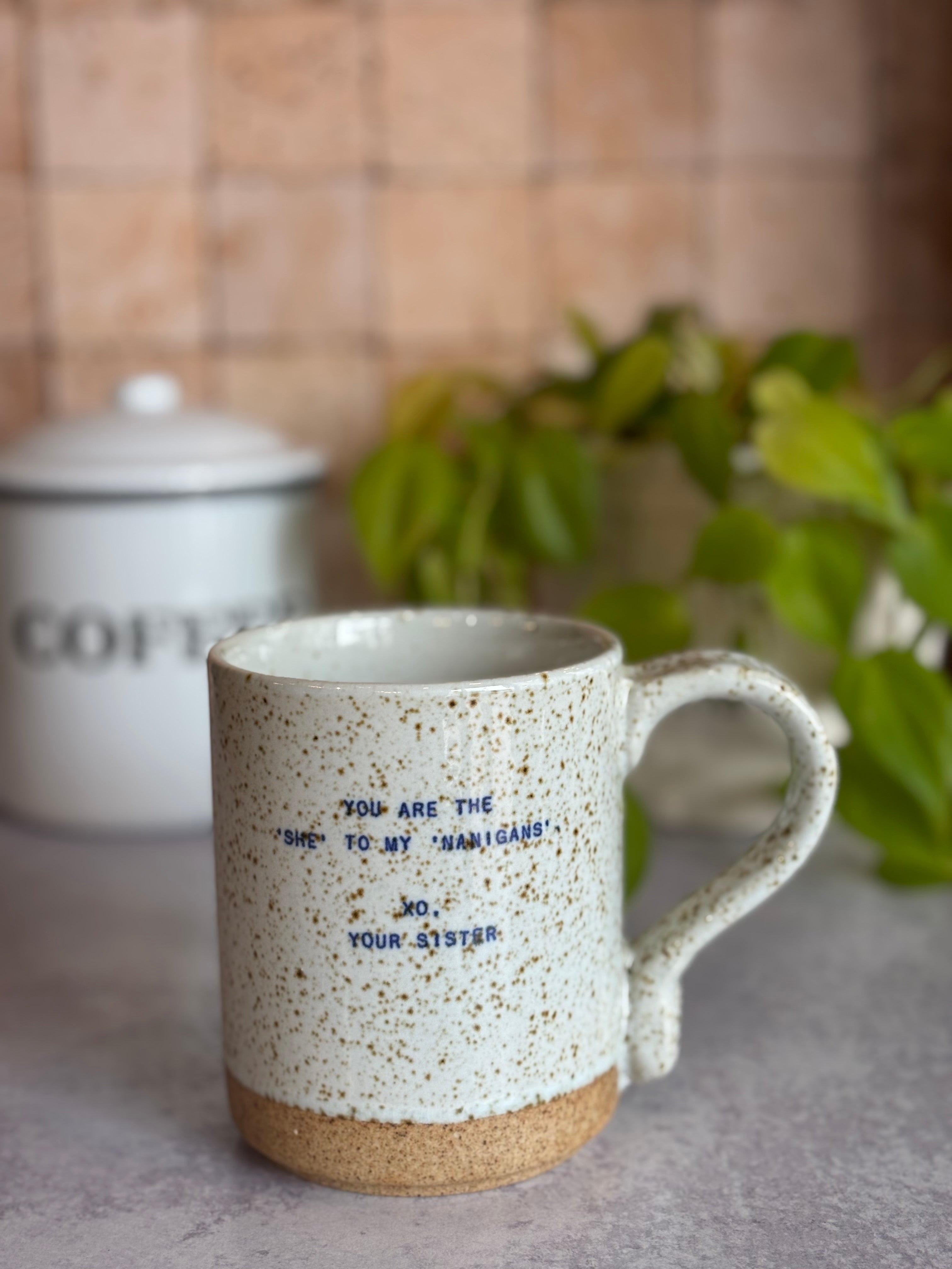 Experience the boho vibes with our XO Mugs featuring fun sayings from your friends and family. Handmade with quotes from your favorite people, these oversized ceramic mugs will hold all your beverage needs. Microwave and dishwasher safe, they're not just a mug, they're a work of art. 15 ounces of pure happiness, variation in color and quotes expected.
