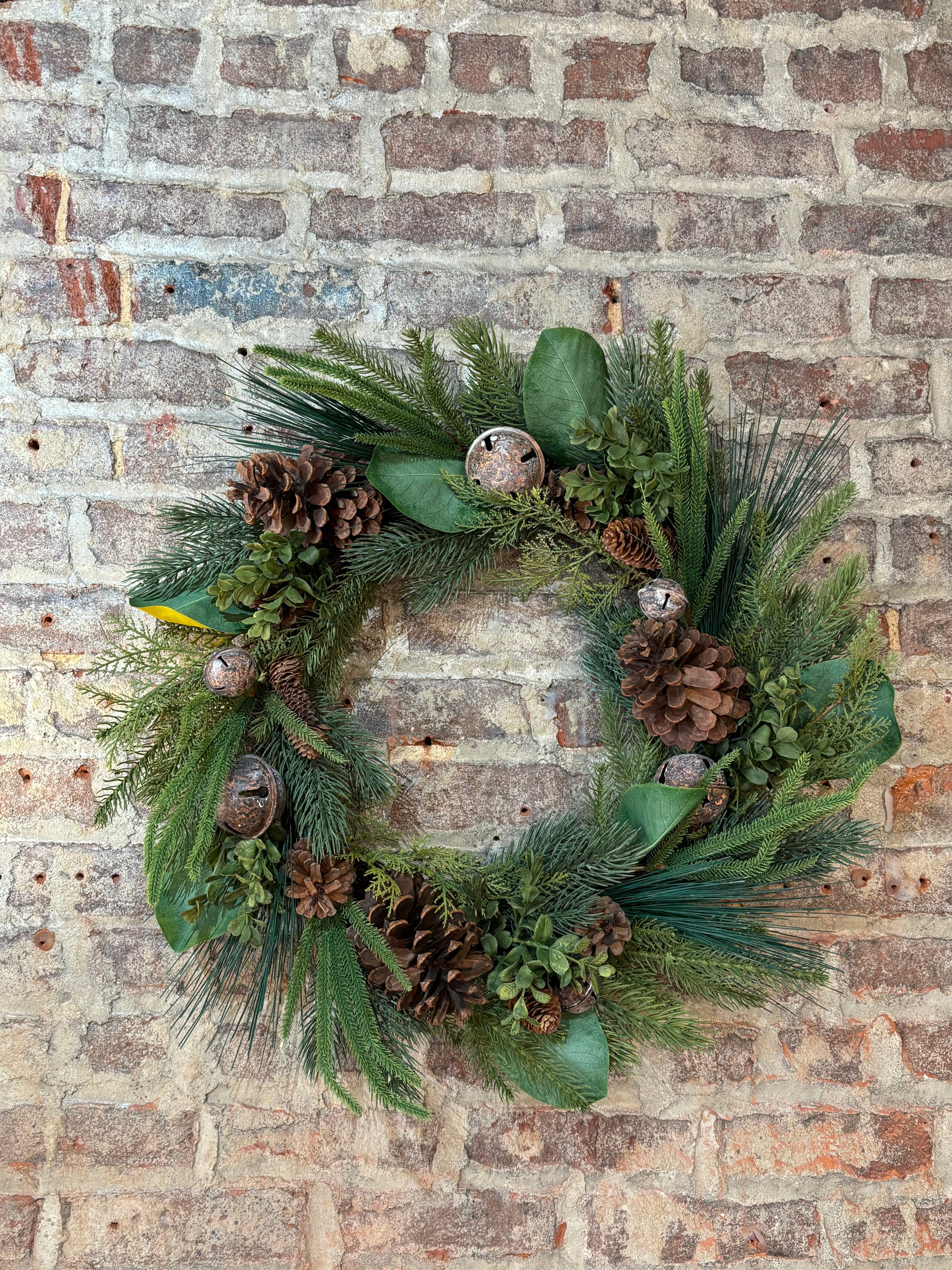 Embrace the Holiday vibe with our 26" Wreath. Adorned with lush greenery, pine cones, and charming bells, this piece brings a touch of nature to your home decor. Perfect for adding a rustic and festive touch to any space.