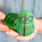 Meet your new literary companion! This charming handmade bookworm is crafted from repurposed book pages, bringing a playful twist to any space. Sporting cheerful green hues, quirky glasses, and delightful little antennas, it's a whimsical addition to classrooms, libraries or reading nooks. Perfect for book lovers, teachers, garden enthusiasts, and bug admirers alike—or as a creative paper anniversary gift. At 3-1/4" H x 2" W x 6-1/4" L, this eco-friendly treasure combines sustainability with imaginative charm.