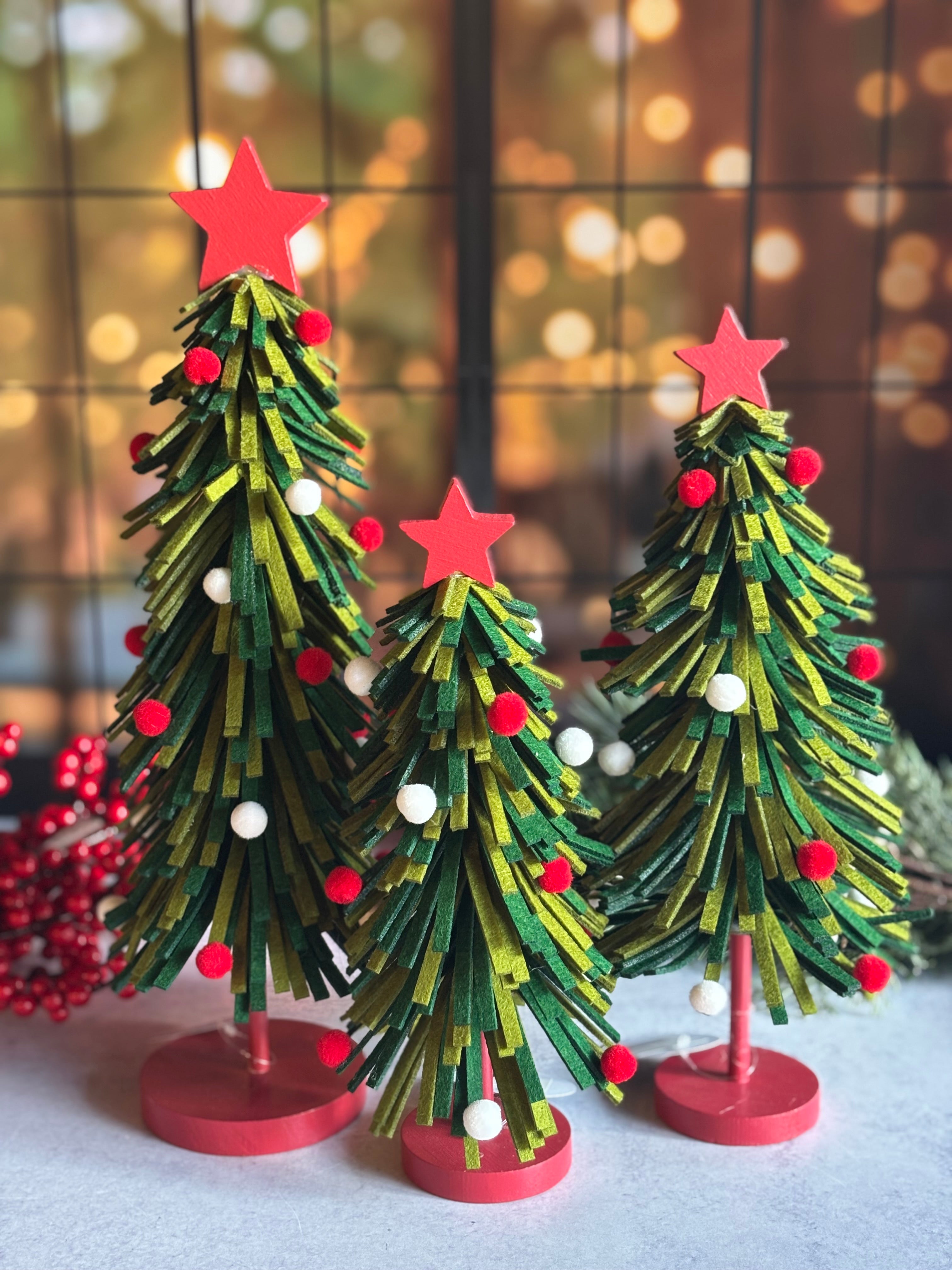 Transform your space into a winter wonderland with these felt trees. Festive in red and green, these high-quality trees come in your choice of 3 sizes and shades for a whimsical touch. Durable and long-lasting, they're perfect for decorating your mantel, shelves, or table and adding a pop of color and holiday cheer.