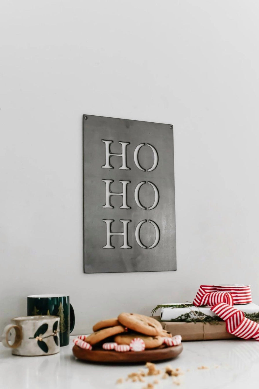 Celebrate the festive season with this charming 14x10 vertical HO HO HO Steel Sign. Designed for indoor use, it adds a playful holiday touch to any room. Its durable steel construction ensures it will bring cheer year after year, brightening your space with whimsical holiday spirit.