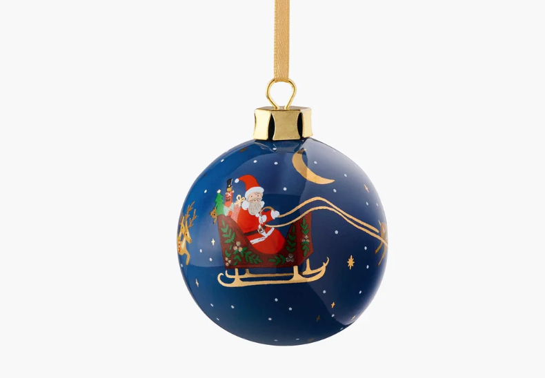 Add a touch of holiday magic to your tree with our Rifle Paper Ornament. Made of porcelain, this ornament is adorned with a festive illustration of Santa and his sleigh, accented with gold detailing for a luxurious shine. Hang it with the included gold ribbon for a festive and elegant addition to your holiday decor.