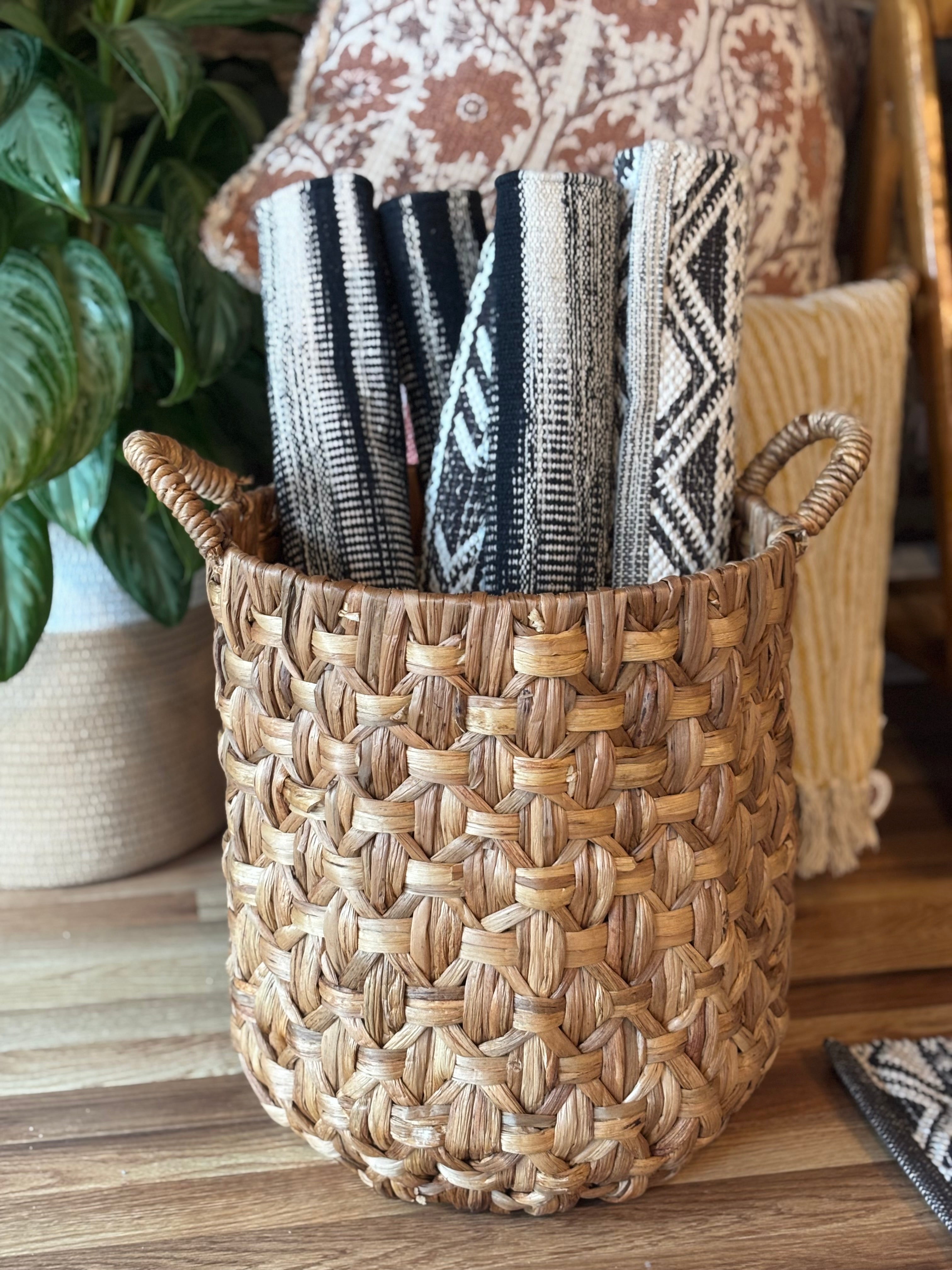 Organize with style using Lauria Baskets. Hand-woven from water hyacinth, these decorative baskets are perfect for storage. Skilled weavers create intricate designs, while the tall and slender shape makes them ideal for hampers or collecting essentials.