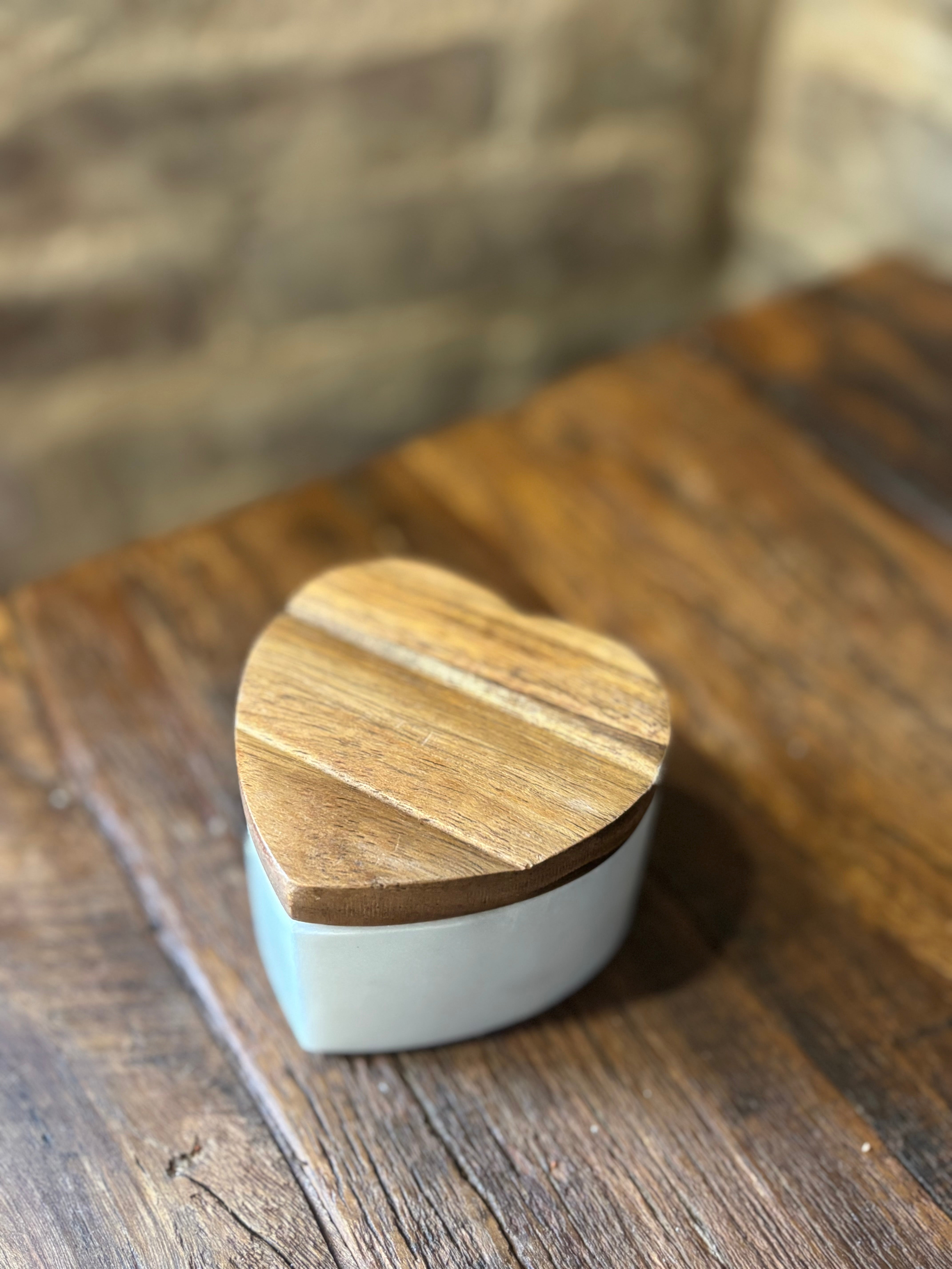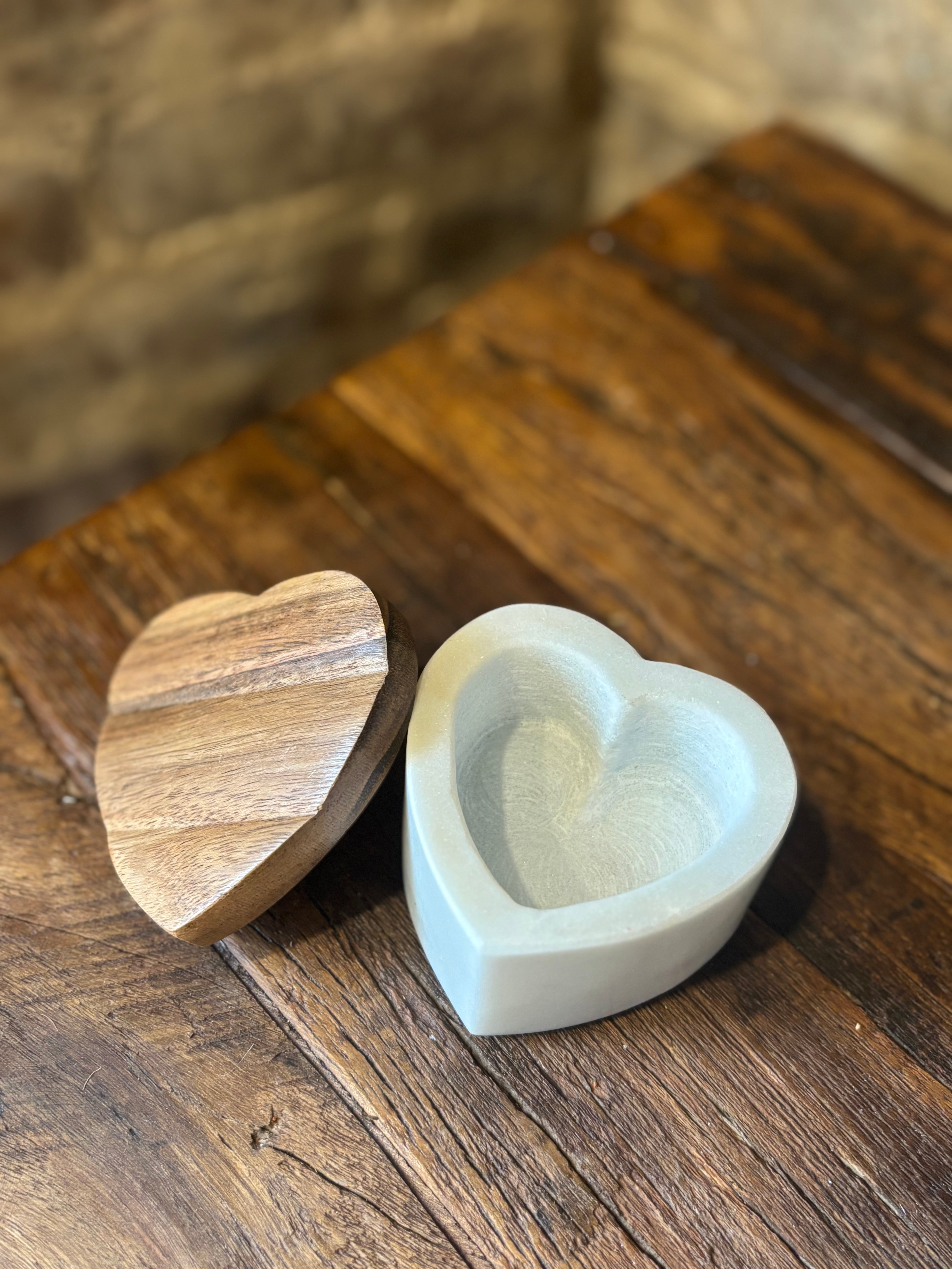 Add a touch of unexpected luxury to your space with this elegant marble heart-shaped container. Featuring a warm acacia wood lid, it's perfect for storing small trinkets or jewelry. The unique variations in the marble make each piece one-of-a-kind. Use it as a decorative piece for a touch of sophistication.