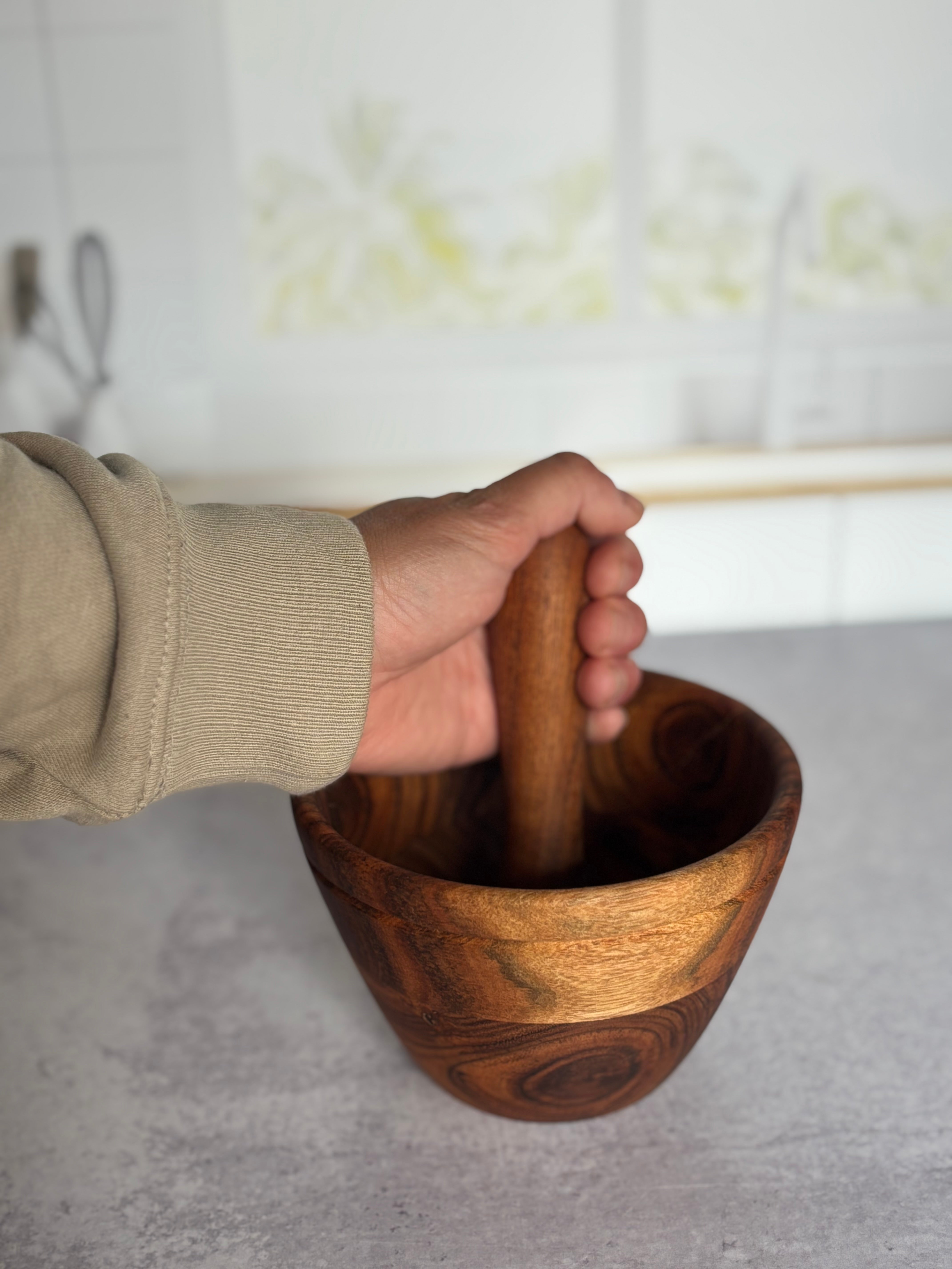 Enhance your kitchen experience with our Wood Mortar and Pestle! Grind fresh herbs, nuts, and spices to create aromatic and flavorful dishes. The all-natural materials add rustic charm to your cooking routine. This is a must-have accessory is perfect for any recipe.