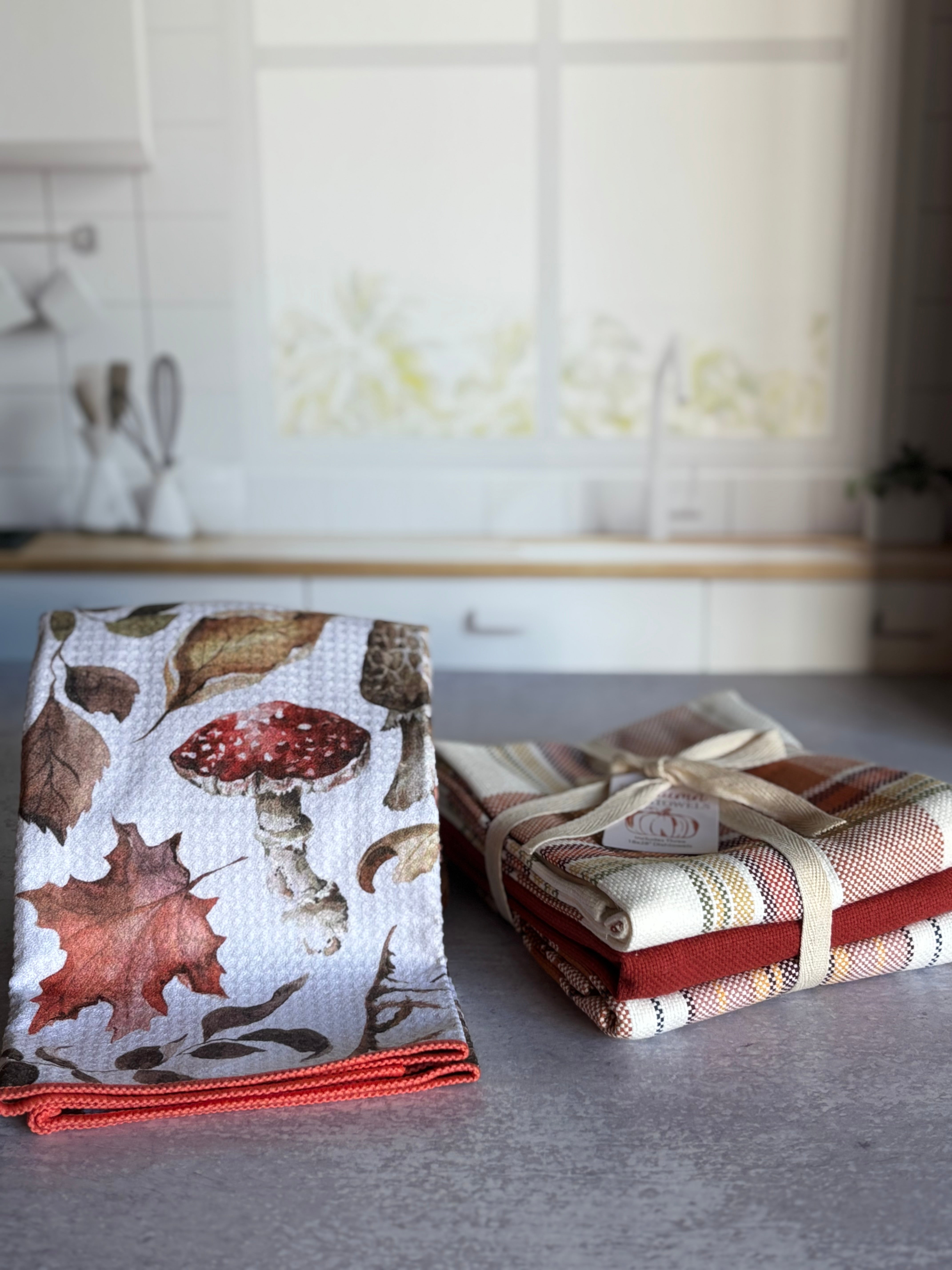 Add a touch of harvest charm to your kitchen with this reversible Autumn Woodland printed microfiber dishtowel. With festive designs of mushrooms and leaves, this towel is perfect for adding a fall touch to your home decor. The highly absorbent and quick-drying material makes it a functional and stylish addition to your kitchen. Perfect for drying dishes or wiping up spills.