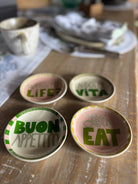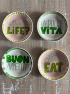 Transform your table into a gallery of personality with these handcrafted stoneware dishes. Each piece features a charming patterned edge and playful multi-color sayings that spark joy and conversation. Available in four distinct styles, they're durable enough for everyday use yet delightful enough to showcase. Mix and match to create your own eclectic tablescape, or stick with a single style for cohesive charm. Perfect for dinner parties or casual family meals, these dishes blend function with whimsy—turning ordinary dining into something wonderfully memorable.