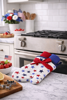 Add a touch of flair to your kitchen with our Patriotic Oven Mitt set. This set includes 2 waffle dishtowels and a printed oven mitt. Keep for yourself or give as a hostess gift. Perfect for protecting your hands and countertops while showing off your patriotic spirit.